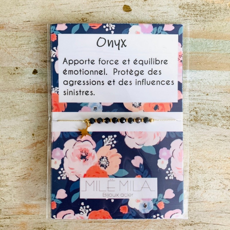 Chaque bracelet est présenté sur une cartonnette aux graphismes différents pour chaque caractèristique des pierres naturelles