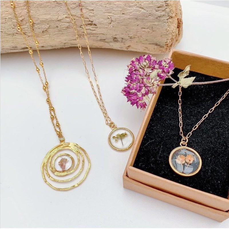 Une alternative au bouquet de fleurs... le collier de fleurs ! Dans une délicate monture en plaqué or, une petite fleurs cueillie par les soins de Fanette, te,drement séchée puis enchâssée dans une résine naturelle.