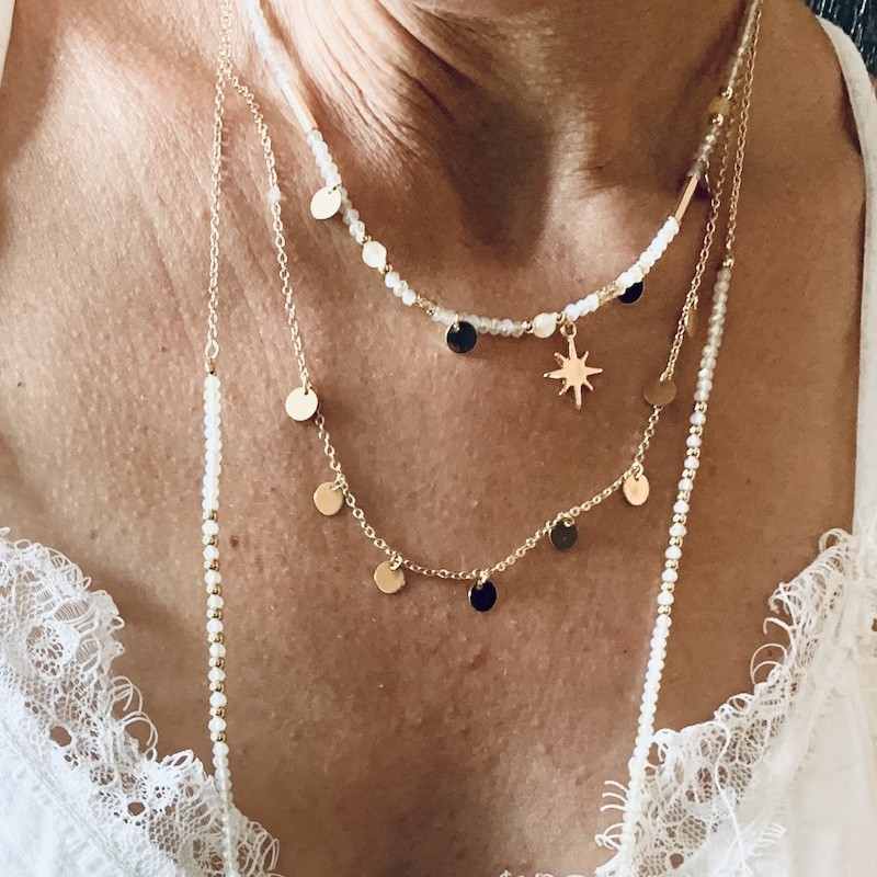 Ce Sautoir 3 rangs est composé d'un premier collier raz de cou aux petites perles dans les teintes claires et sa croix du Sud de 38cm ; d'une deuxième chaîne dorée et ses pastilles de 44cm, et d'un collier long aux perles transparentes et dorées de 77cm